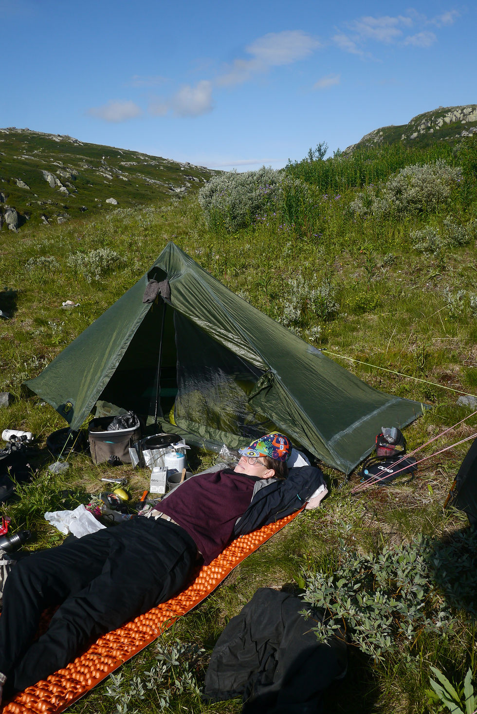 Sopiva leiripaikka kuitenkin löytyi ja aamuaurinko rentoutti väsyneitä retkikuntalaisia.